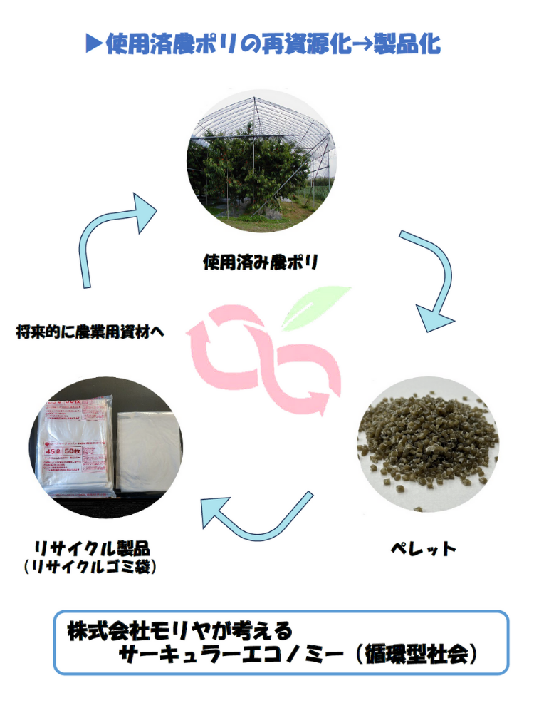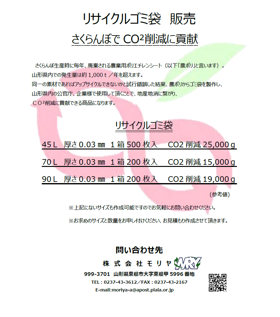 モリヤでは山形のさくらんぼ農家で使われた「農ポリ」をリサイクルし、ゴミ袋として生まれ変わらせました。